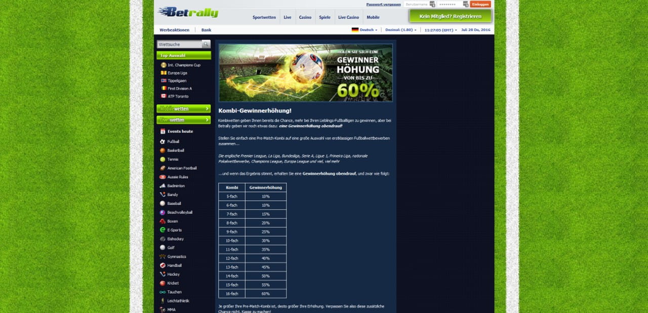 Je mehr Tipps miteinander kombiniert werden, desto höher ist auch die Gewinnerhöhung. Die nachfolgende Aufstellung gibt Aufschluss über die von Betrally gewährten Prozentsätze für die jeweilige erfolgreiche Kombiwette: